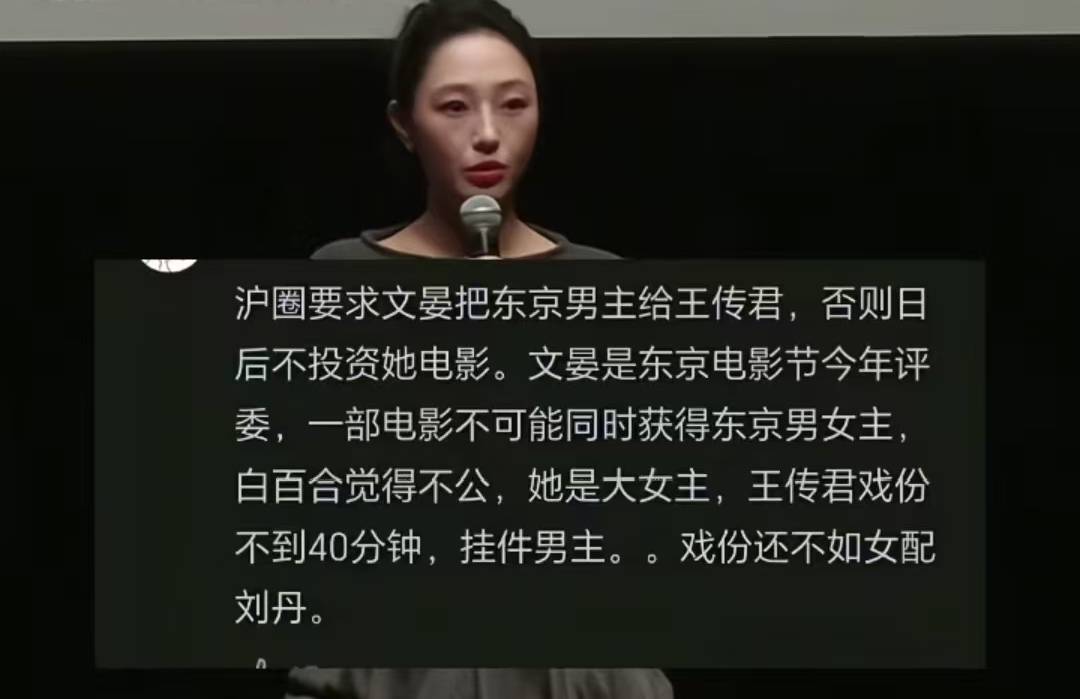 当时的爆料内容是,沪圈要求文晏把东京最佳男主给王传君,不然以后都不会投资她的电影了,文晏作为今年东京电影节的评委之一,有操作的权利。
