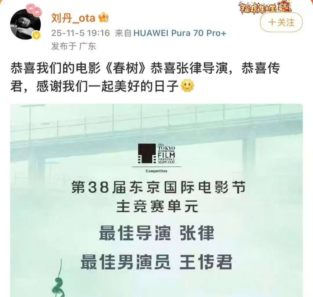 刘丹在王传君得奖的消息公布后,就发文祝贺了《春树》的导演和王传君,还亲切的称呼王传君为“传君”,看着俩人关系挺不错的。